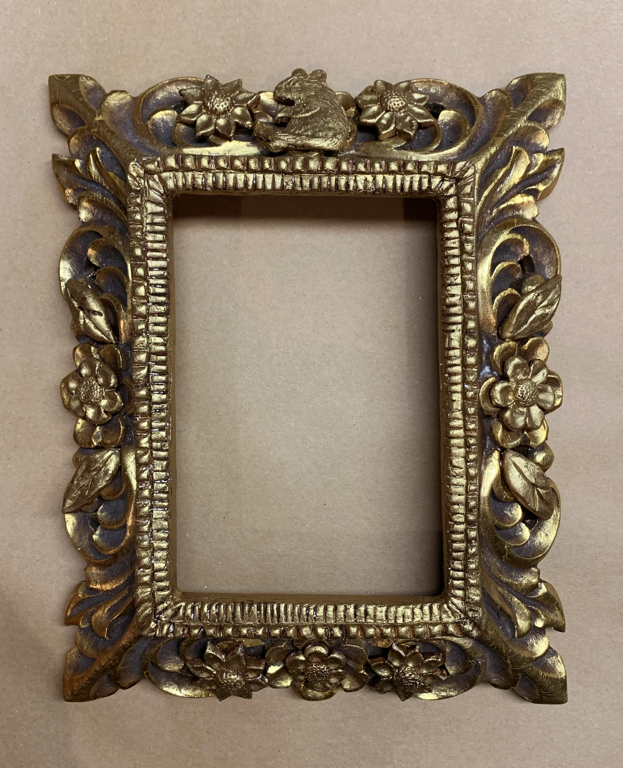 But I am happy with how it came out! Sadly, I was having so much fun that I forgot to take a before picture of this one below. Oopsey! But the top mouse silhouette, the bottom tulip and the daisy like flowers were sculpted and added on this one. It added just the right amount of whimsy to the frame I felt it was missing. I can’t wait to show you the painting it’s for! Top secret for a couple weeks yet. Ha!